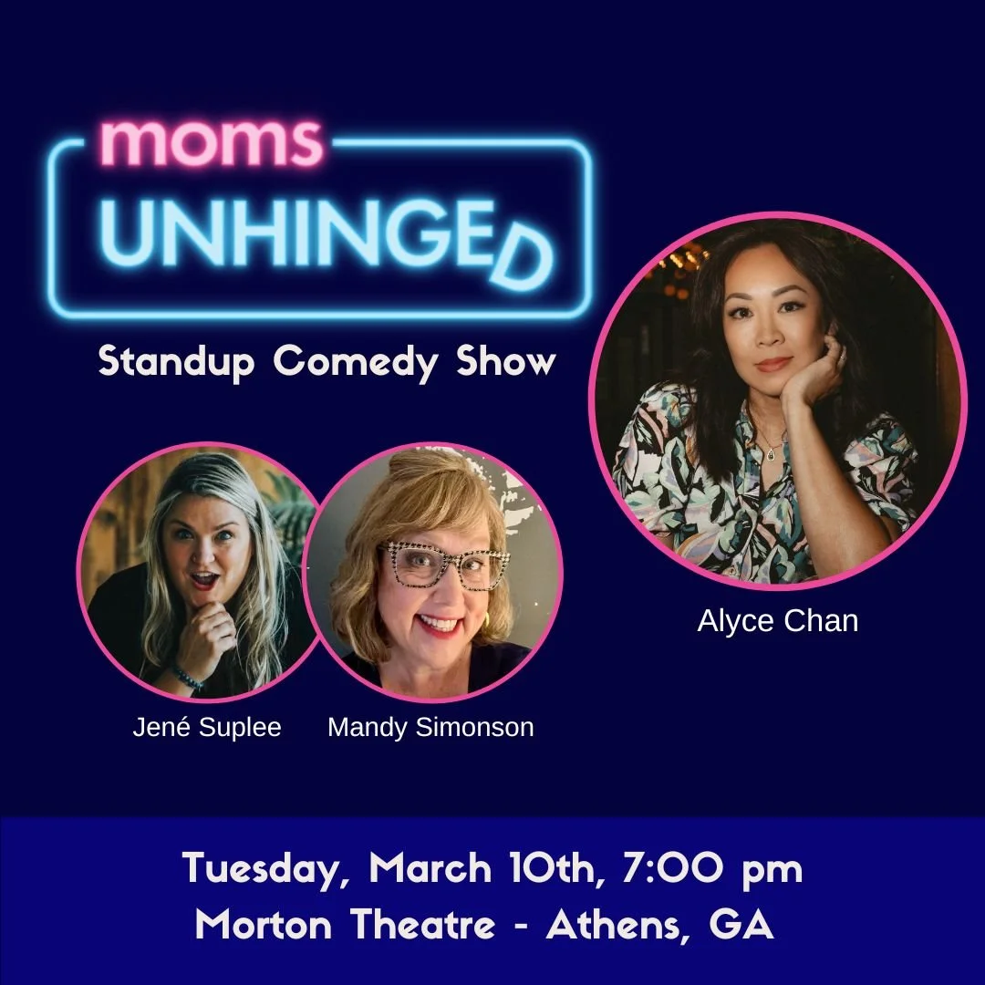 Join us for a night of laughter as we explore everything from motherhood, midlife crisis, marriage, divorce, online dating, and other things that irritate us. Men are welcome to the show, too. Moms Unhinged has been selling out shows all over the country and is coming BACK to Athens with a BRAND NEW lineup of mom comedians. Featuring clean(ish) comedy, this is a fun night out with your girlfriends, drinking club (we mean book club), neighborhood group, or your own mom. Laughter is proven to lower your cortisol!